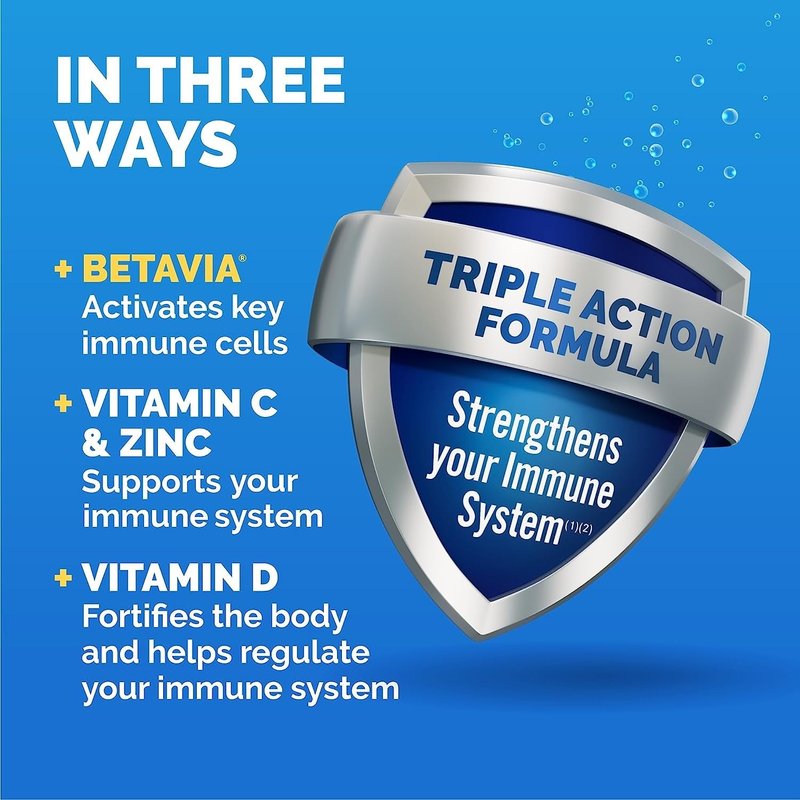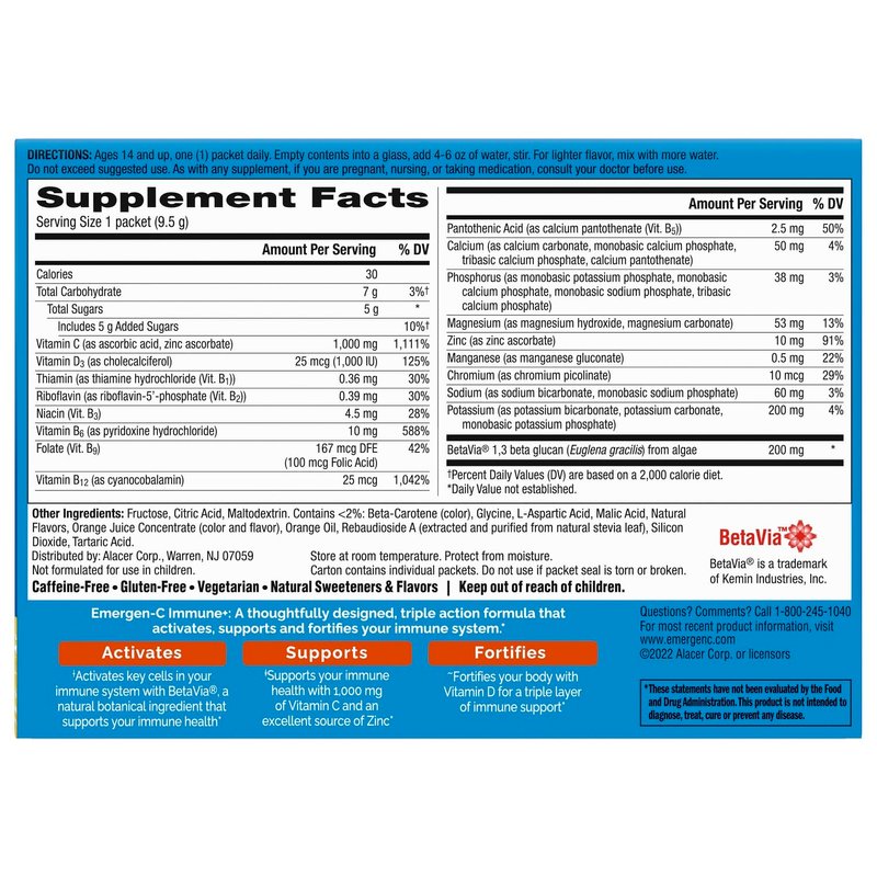 - 30ct of Emergen-C Immune+ Triple Action Immune Support Powder, with 200mg of BetaVia (R), 1000mg Vitamin C per serving, B Vitamins, Vitamin D, Zinc and Manganese (2)