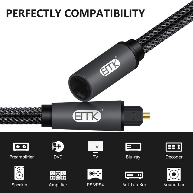 EMK Optical Extension Cable Male to Female Coupler CableToslink Audio Cable Nylon Braided Jacket 24K Gold-Plated Fiber Digital Extension Adapter Cable for Home Theater Sound bar TV PS4 Xbox 3.3ft