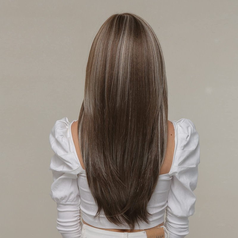 EMMOR Brown Wigs for Women,Long Layered Wigs with Curtain Bangs Heat Resistant Synthetic Fibre Wigs(Brown with Grey Highlight)