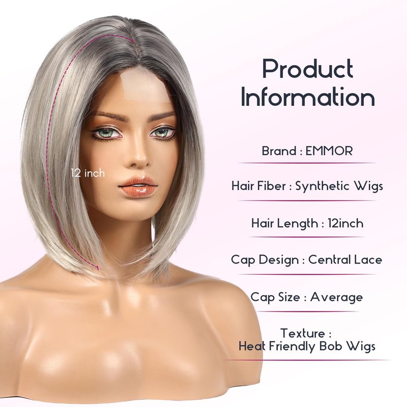 EMMOR Short Bob Wigs,Natural Shoulder Length Central Lace Bob Wgs, Premium Heat-Resistant Synthetic Straight Wigs for Women Daily Use(Ombre Ash)