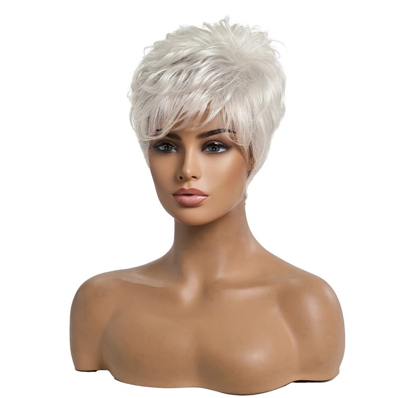 EMMOR Short Silver Grey Human Hair Wigs for Women Blend Pixie Cut Wig With Bang,Natural Daily Use Hair (Color 101#)