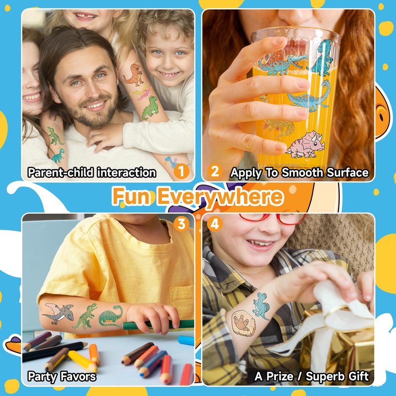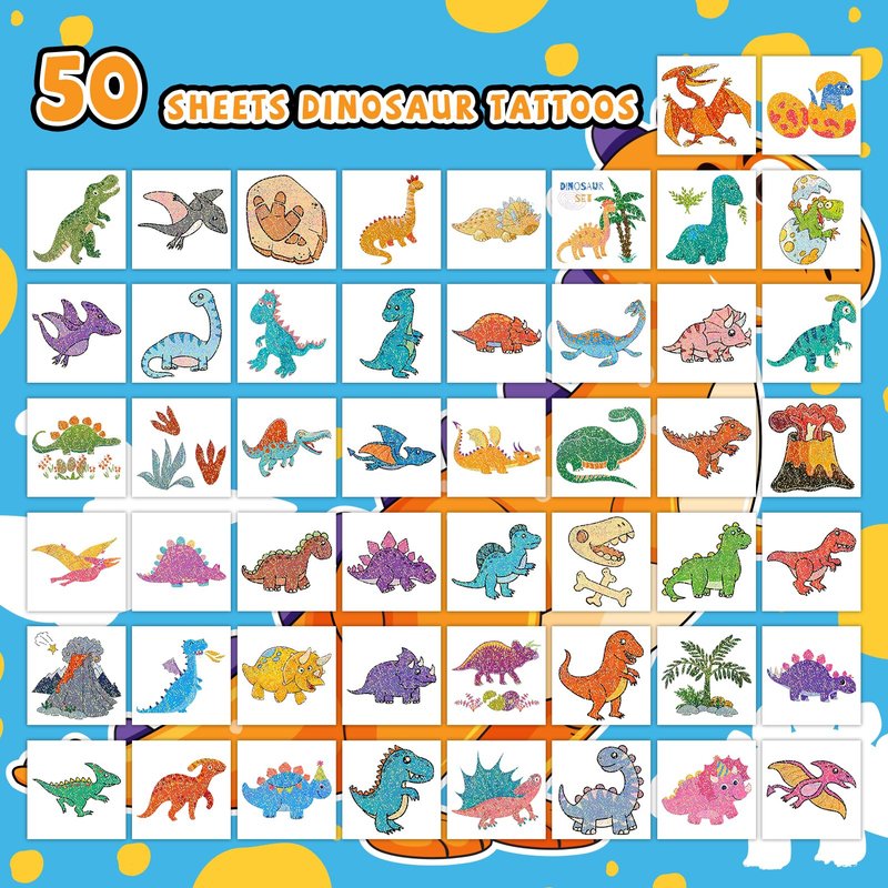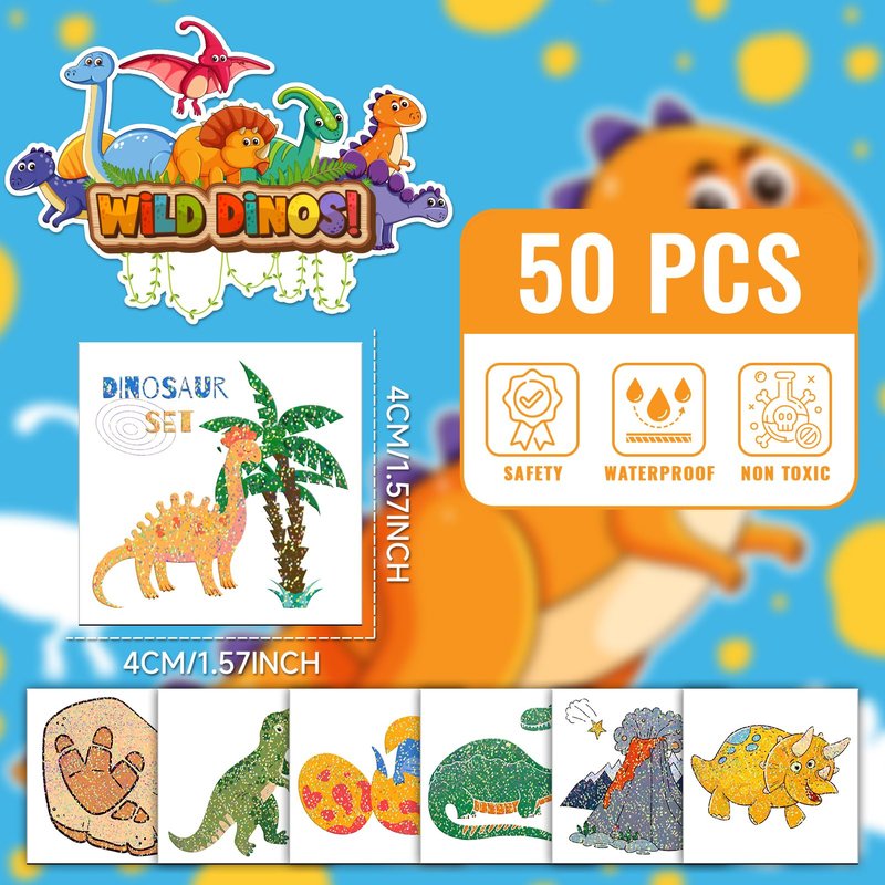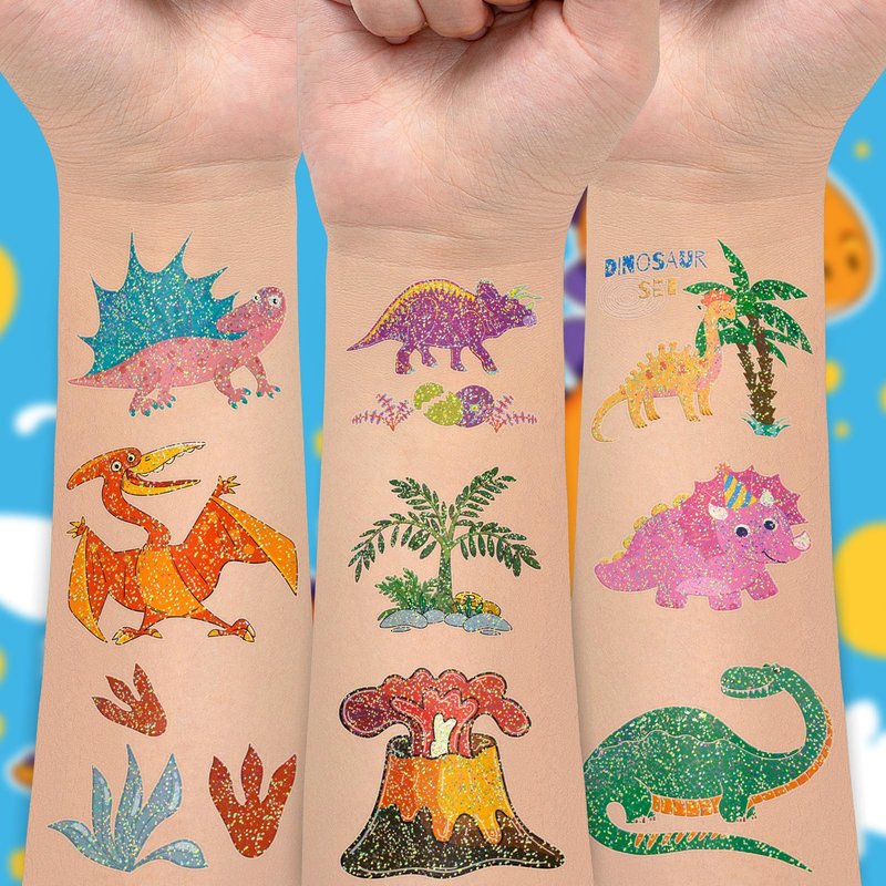 - 【Kids Dinosaur Party Tattoos】50 pcs glitter dinosaur tattoos for kids, these cute temporary tattoos will shine under the sun and light with a beautiful appearance, adding an extra touch of fun to a dinosaur party or event for your children.