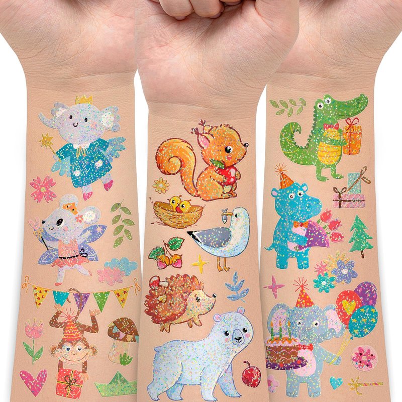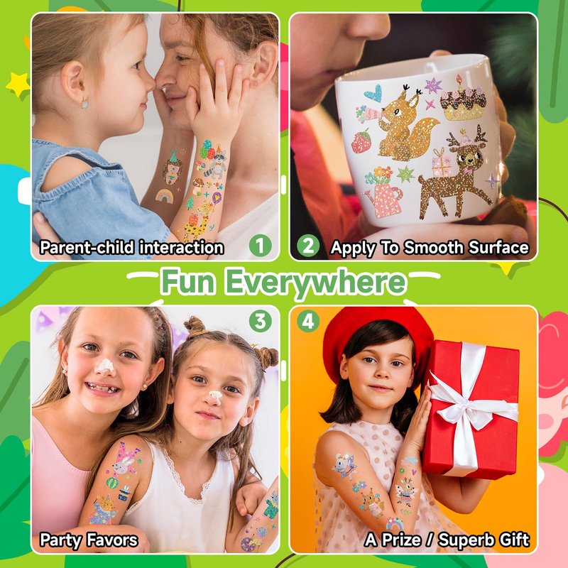 - 【Glitter Tattoos for Kids】These tattoos for kids are made of glitter, which will display an unparalleled visual effect under the light. Each tattoo boasts a unique design that is beautiful and distinctive. Adorned with these charming tattoos, your children will undoubtedly become the center of attention in any crowd.