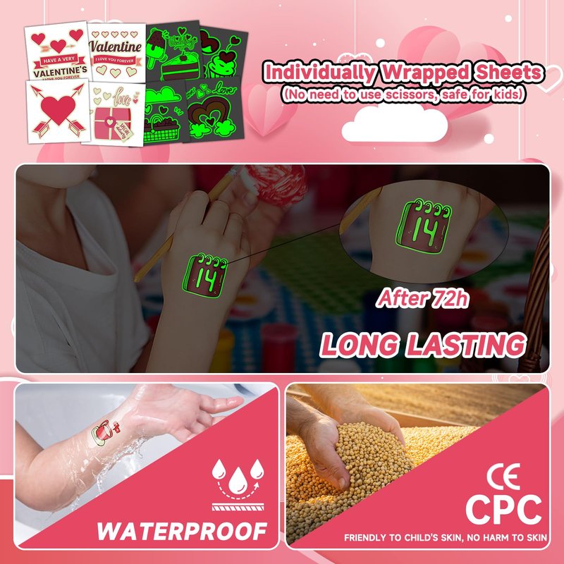 - 【Glow Tattoos for Kids at Valentine's Parties】Compared with ordinary tattoo stickers, this Valentine's Day kid's temporary tattoo is made of luminous-in-the-dark process, using them at games or parties can make you more radiant! Choosing them as a Valentine's Day favor for family and friends is a great choice.