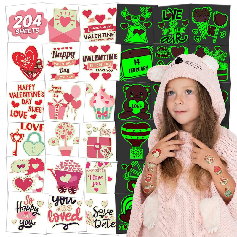 EMOME 204 PCS Individually Wrapped Luminous Valentine's Day Temporary Tattoo Kids, Glow Kiss Heart Tattoos Temporary for Women Kids, Valentine's Day Accessories Decorations Party Favors Supplies