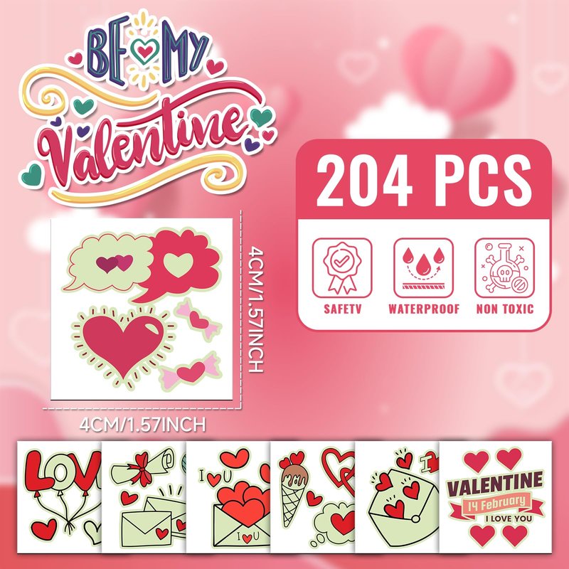 - 【204 Individually Wrapped Glow Tattoos】There are 204 Individually Wrapped different Valentine's elements patterns temporary tattoos for kids in one package. Great size and quantities for kids to play on Valentine's Day. It is convenient and safe for kids to play without using scissors.