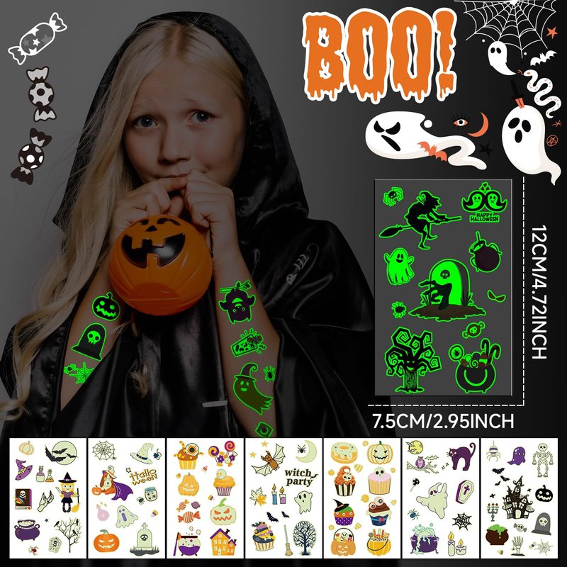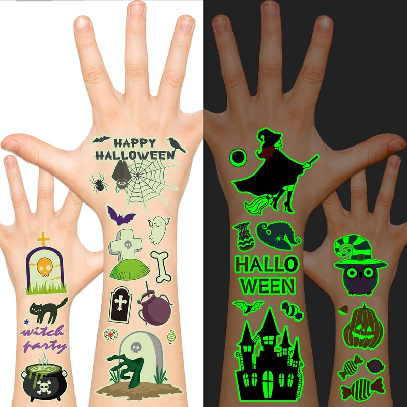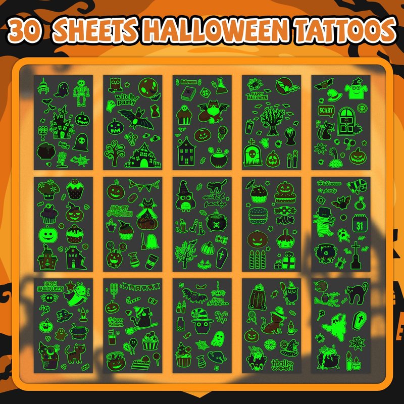 - 【Halloween Glows Tattoos】30 sheets of Halloween glows tattoos, designed with popular spooky motifs that children adore, like vampires, ghosts, black cats, spiders, zombies, skeletons, and more! Suitable for adding a magical touch to any Halloween celebration.