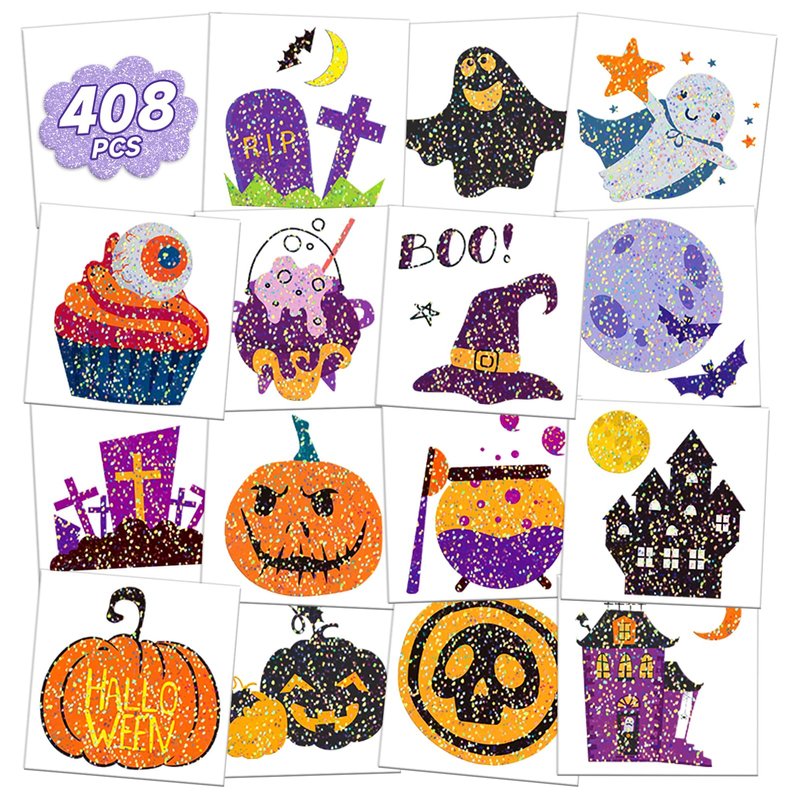 EMOME 408 PCS Glitter Halloween Temporary Tattoos for Kids, Cute Tattoo Stickers for Halloween Birthday Party Decorations, Individual Wrapped Kids Tattoos Bulk Special for Halloween Non-Candy Treats