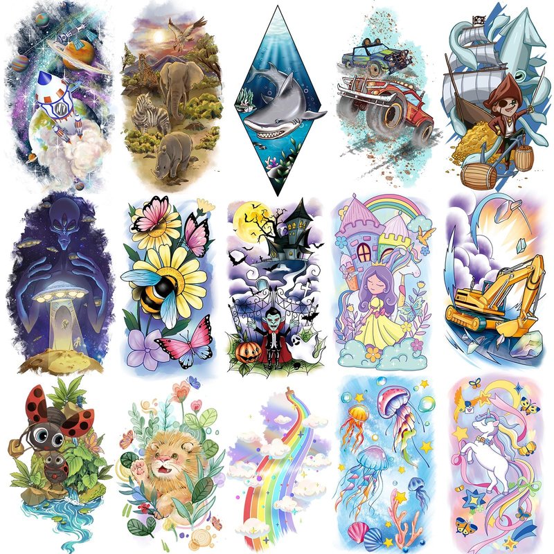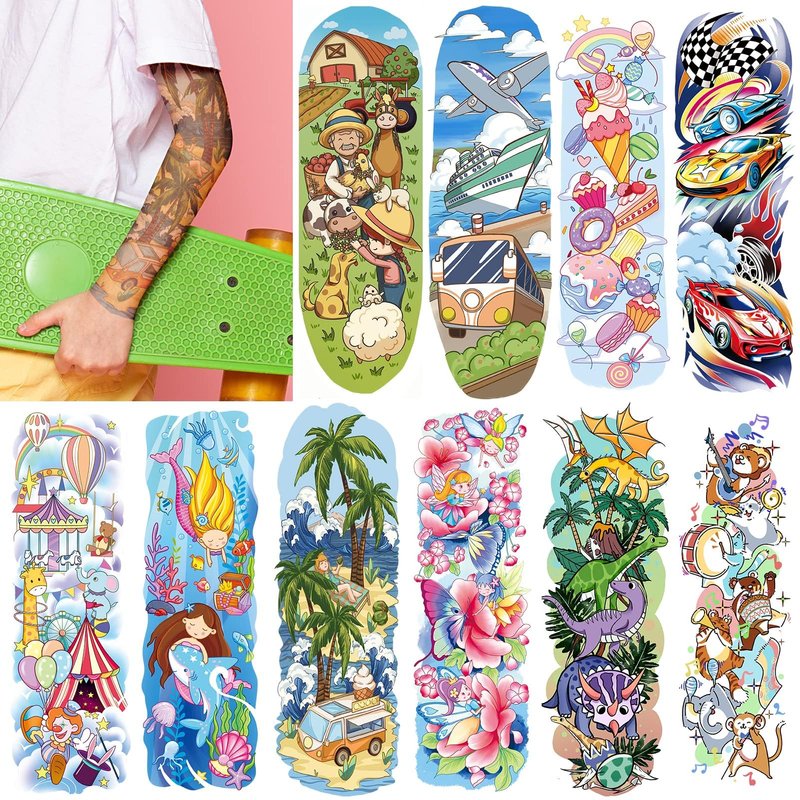 - 【You Will Get】66 sheets temporary tattoos for kids, 10 sheets full sleeve temporary tattoos,15 sheets half arm tattoo sleeves for kids, 41 sheets mix styles kids tattoos, rich in elements like mermaid, donut, space, car, truck, animal, and more, different sizes, no repeat patterns, to meet your kids' various needs, let kids enjoy stickers fun!