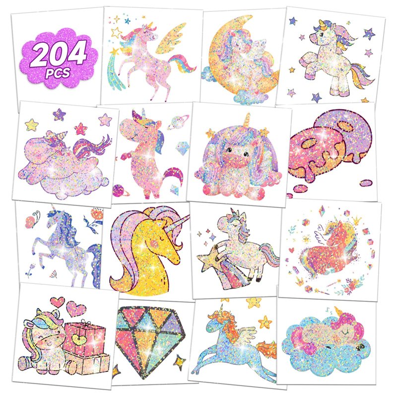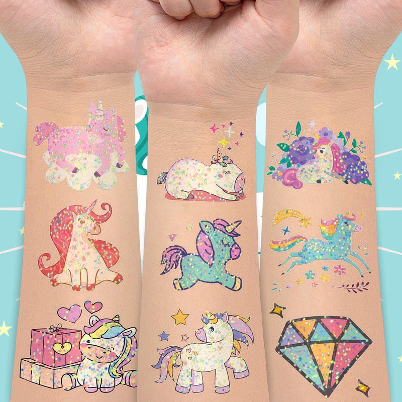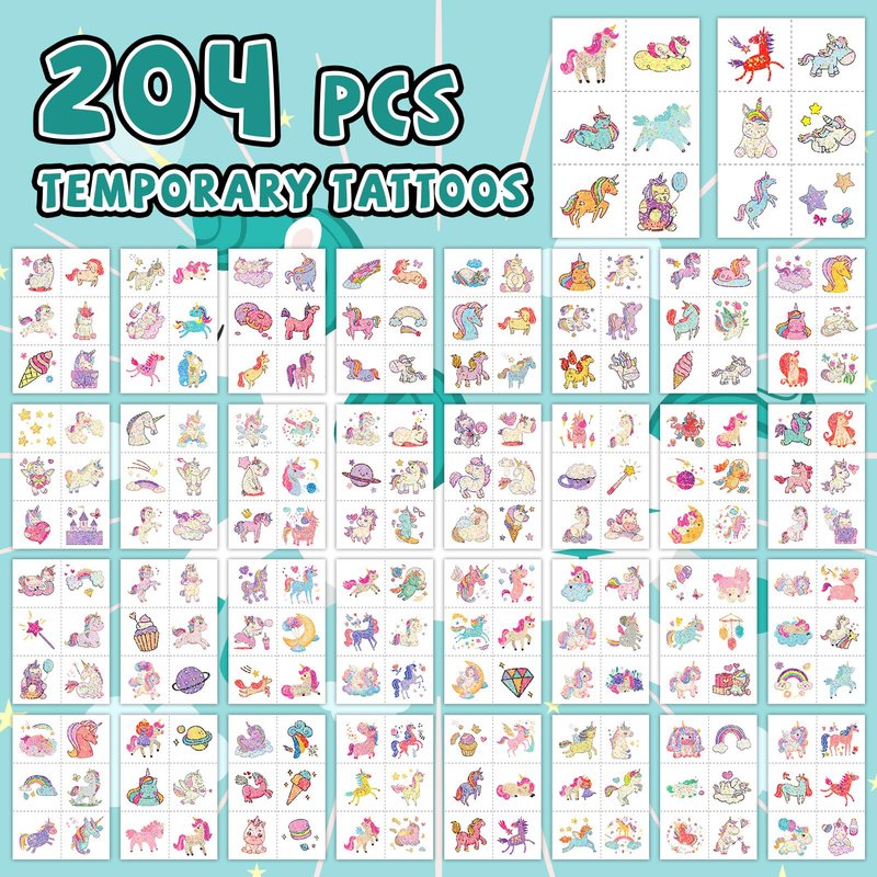 - 【Temporary Tattoos for Girls】204Pcs Individual Wrapped temporary tattoos with various designs tattoo stickers for girls' favor, these temporary tattoo stickers can sparkle in the sunlight. Little girls deeply love the glitter tattoos, and they are great fun for a girl's party favors or a girl's birthday party decorations.