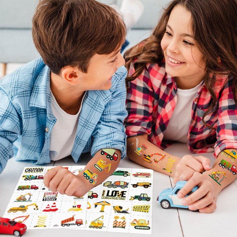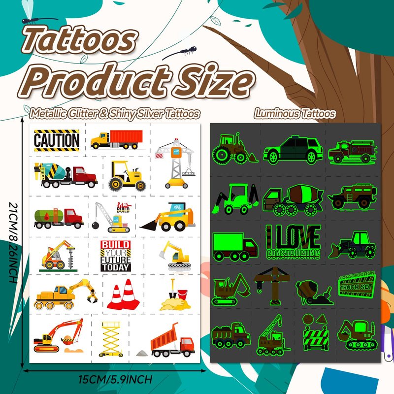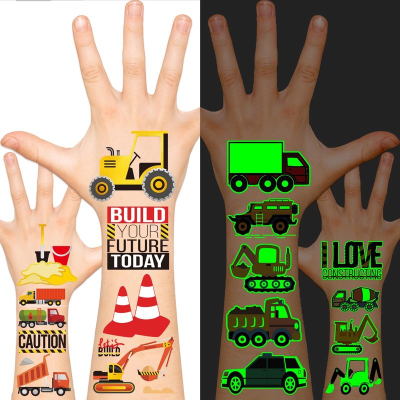 EMOME Glow + Metallic Temporary Tattoos for kids, Waterproof Pre-cut Tattoo Stickers, Birthday Girl Boy Party Favors Supplies Accessories (Construction)