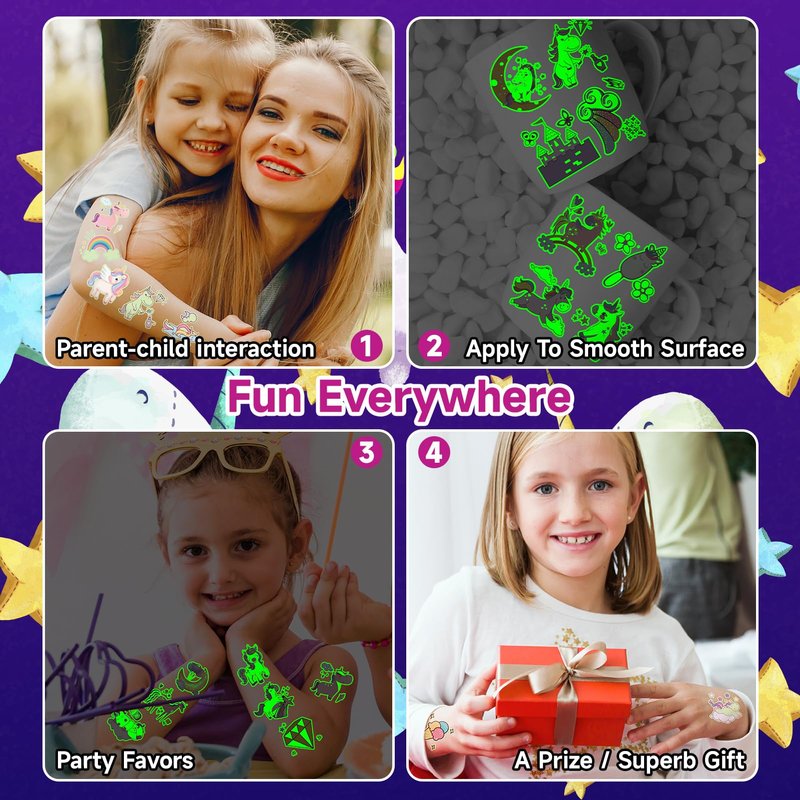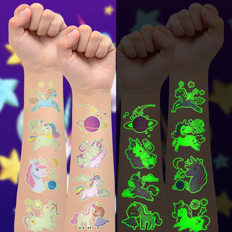 - 【Glows Tattoo Stickers for Girls Party】Unique Party Fun! These glows kid tattoos add a touch of uniqueness to your Glows Party! They charge with sunlight during the day and shine bright at night, adding a magical touch to your event. Tip: For a longer-lasting luminous effect, expose your fluorescent tattoos to light for a few minutes to fully activate them.