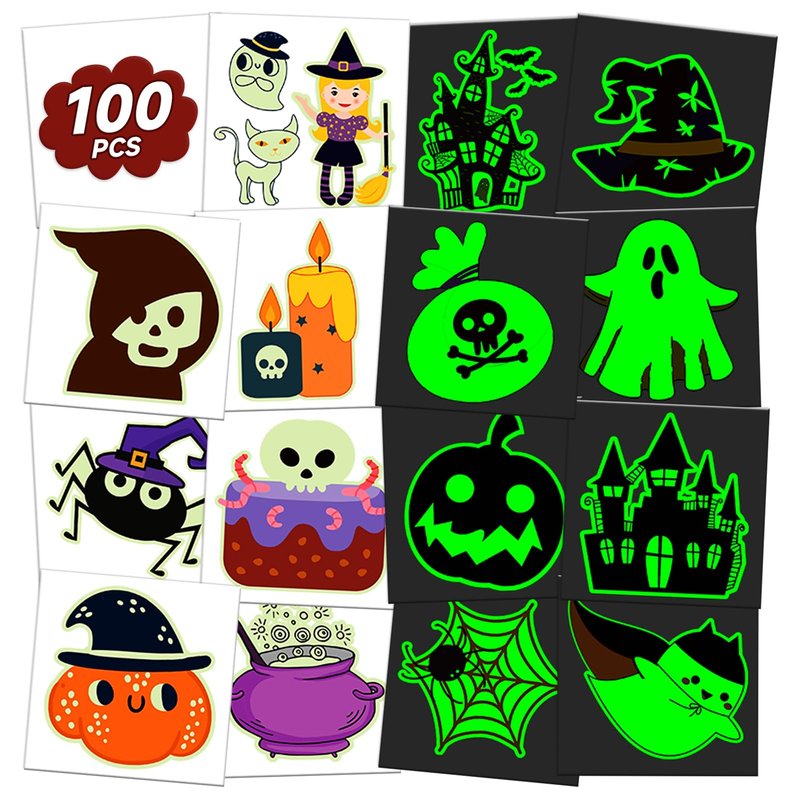 EMOME Halloween Party Favors Tattoo Stickers Luminous, Glows Temporary Tattoos for Kids Birthday Party Decorations Supplies, Halloween Candy Goodie Treat Bag Fillers (100 Pcs)