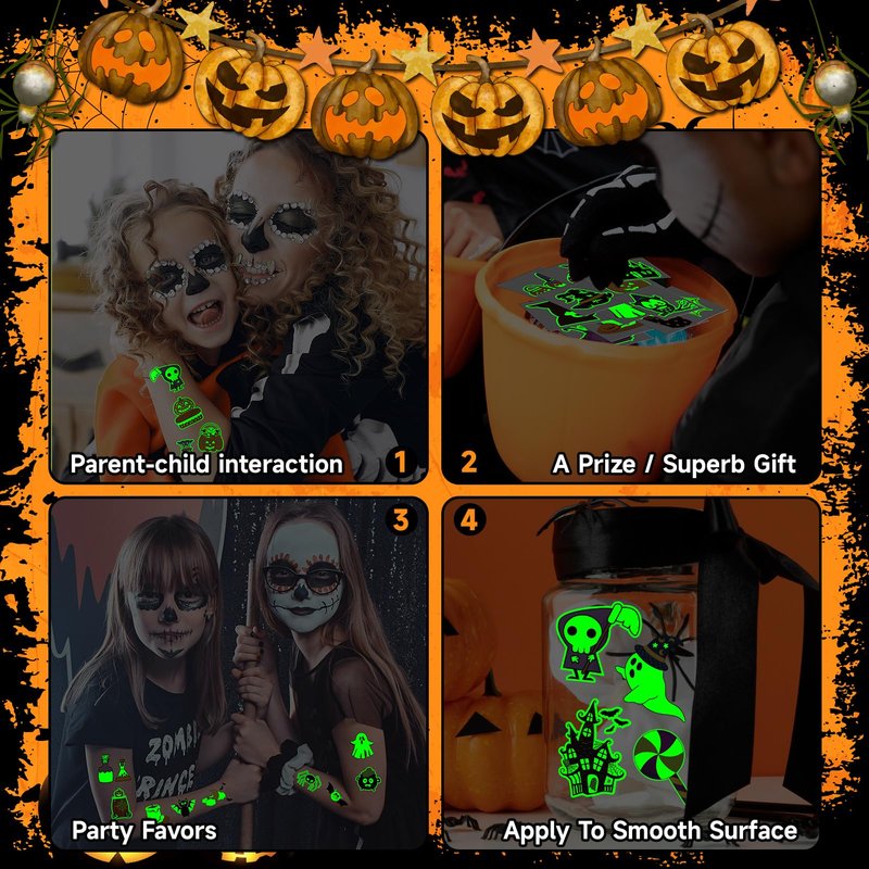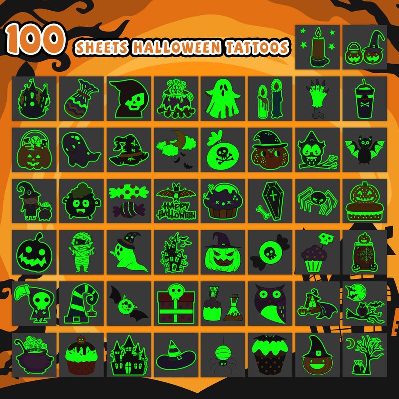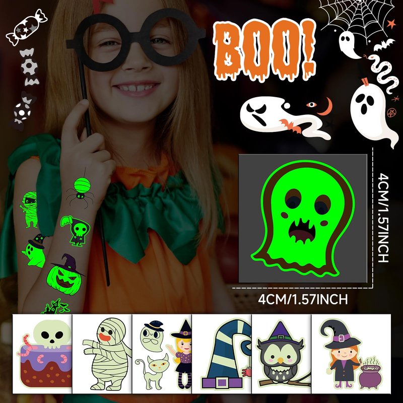 - 【Halloween Glows Tattoos】These unique glows tattoos feature a special luminescent material that shines brightly in the dark. Halloween tattoo stickers are individual sheets suitable for Halloween parties and trick-or-treating adventures, which can add more fun to the activities.