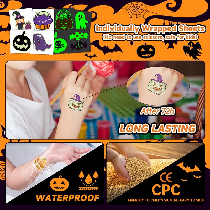 - 【Safe and Non-Toxic】All temporary tattoos are made with eco-friendly materials that are skin-friendly and hypoallergenic, ensuring a safe and enjoyable experience for all ages. Your kids can share it at the party, Halloween tattoos can be applied to hands and arms, or decorate some smooth object, such as a bottle, box, glass, etc.