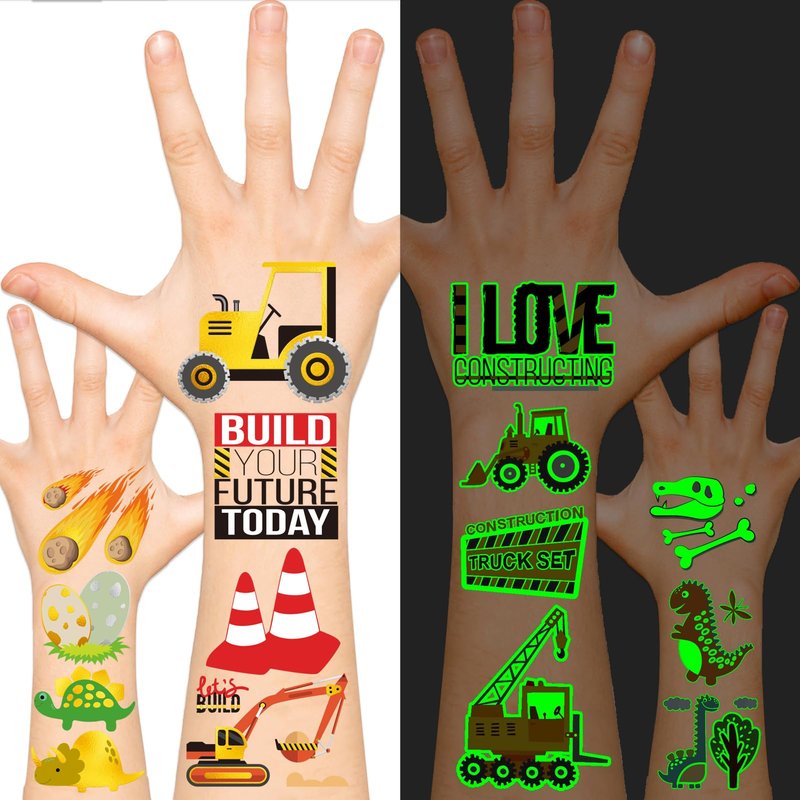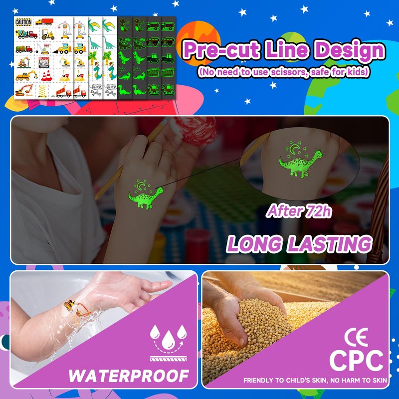 - 【Metallic + Glow Tattoos for Kids】Temporary tattoos are a hit with kids. Each set features 8 sheets, 4 tattoo stickers adorned with metallic glitter elements, and 4 tattoo stickers with glow elements, designed with a variety of styles to appeal to both boys and girls. These tattoos are kid-friendly and measure 7.26 inches * 5.9 inches.