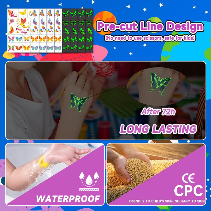 • 【Metallic + Glow Tattoos for Kids】Temporary tattoos are a hit with kids. Each set features 8 sheets, 4 tattoo stickers adorned with metallic glitter elements, and 4 tattoo stickers with glow elements, designed with a variety of styles to appeal to both boys and girls. These tattoos are kid-friendly and measure 7.26 inches * 5.9 inches.