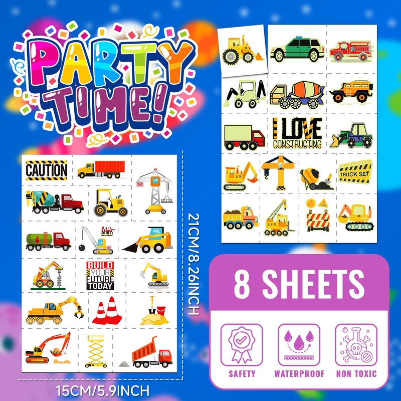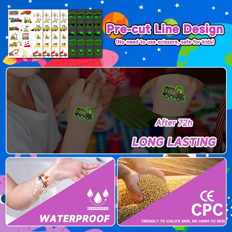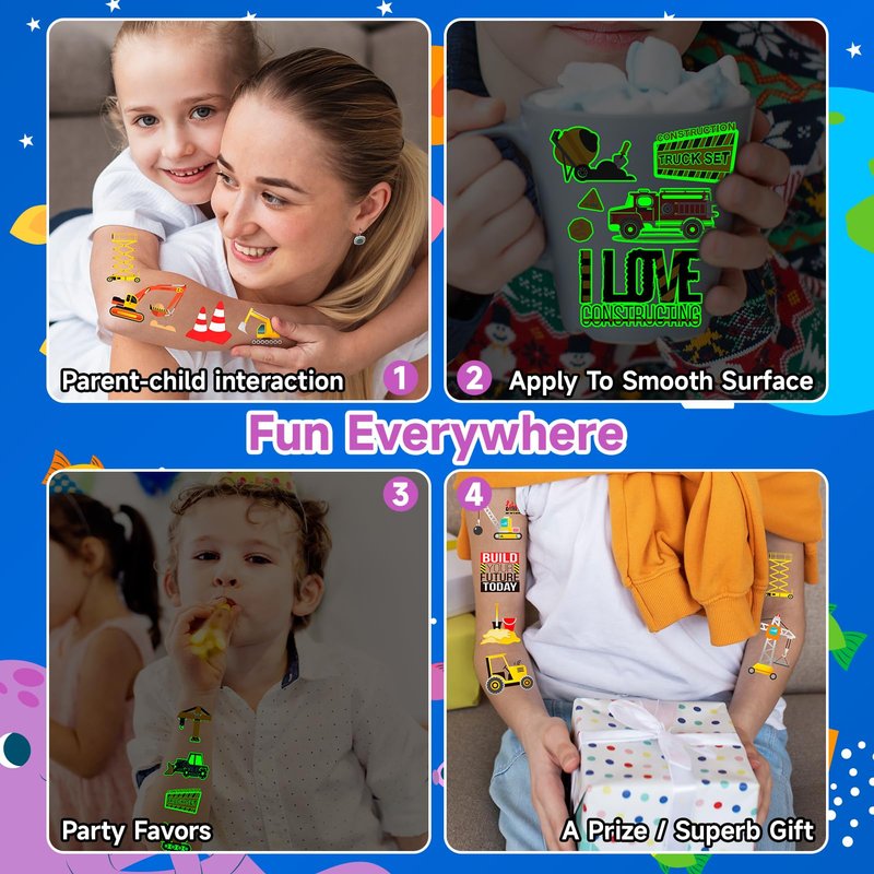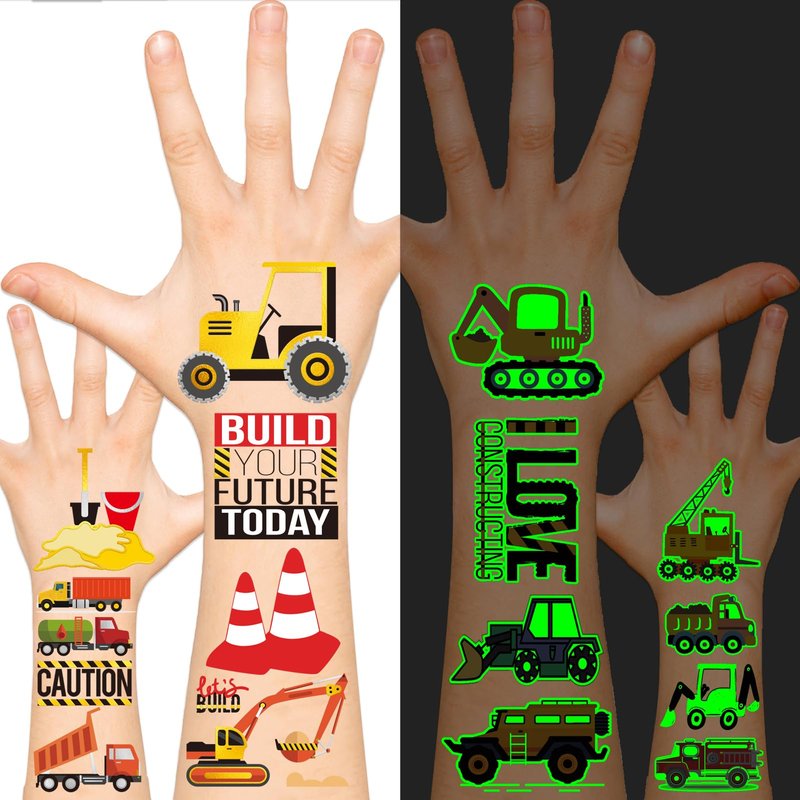 EMOME Temporary Tattoo - Glow + Metallic Glitter Style Tattoos for Kids Party Supplies, Temp Tattoos Sticker for Boys Girls, Birthday Party Favor Decorations Accessories (Construction)