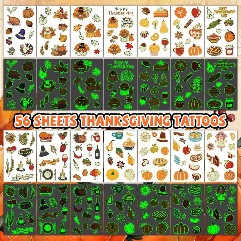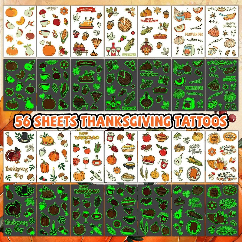 - 【Autumn Harvest theme tattoos】The fall tattoo patterns come in a variety of different designs, each pattern is great for decorating our body! The Thanksgiving tattoos feature Thanksgiving elements designs, including happy Thanksgiving, Thanksgiving Day, pumpkin, wheat, maple, leaf, chestnut, corn, grapes, apple, pears, turkey, chicken drumsticks, owl, Mushrooms, sunflowers, sandwiches, bread, wine, hats, vegetables, and so on.