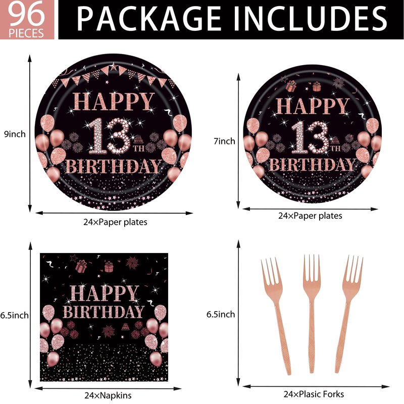 - 13th Birthday Party Supplies: This set includes 96 pieces to serve 24 guests.You'll receive 24 black and rose gold dinner plates(9in),24 dessert plates(7in),24 napkins(6.5in),and 24 plastic rose gold forks.Everything you need for a stylish celebration is in one package.