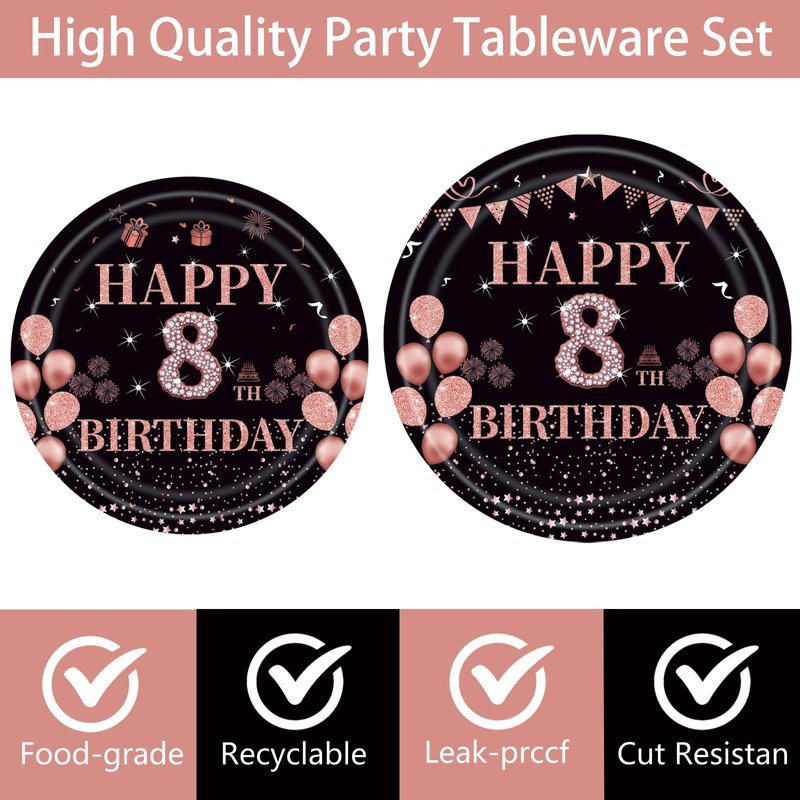 - Elegant Rose Gold Design: Featuring a sophisticated black background with rose gold accents with a bold "Happy 8th Birthday" font against a black background,these plates are adorned with elements like banner,balloons,pink diamonds.The beautiful and novel design creates a rich party ambiance that will impress your family and friends.