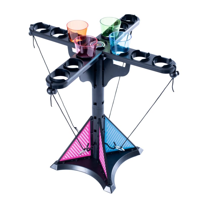 - Includes 1 Tower (1 Base, 4 Bumpers, 2 Poles, 1 Topper, 4 Arms, 4 Arm Supports, 4 Hooks), 4 Strings with Adjustable String Closures, 4 Rings, 4 Shot Glasses, 2 Sticker Sheets, and Complete Instructions