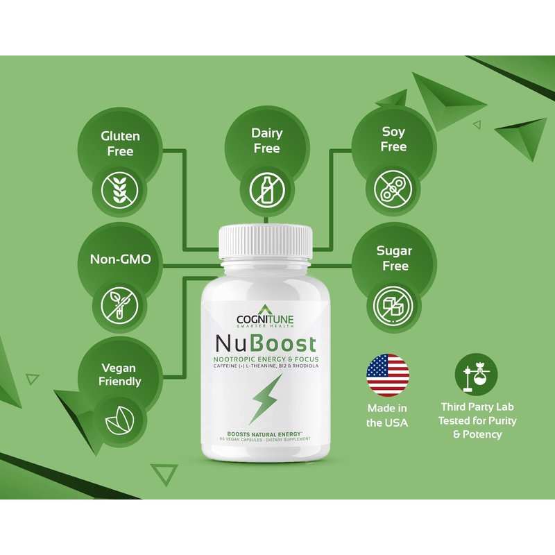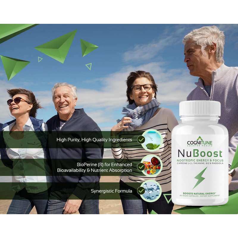 - [Advanced Smooth Energy & Focus Supplement] Our Caffeine L Theanine blend plus Rhodiola and B12 works together to promote smooth, sustained mental energy and focus throughout the day. Boost brain energy and alertness while feeling calm with NuBoost.
