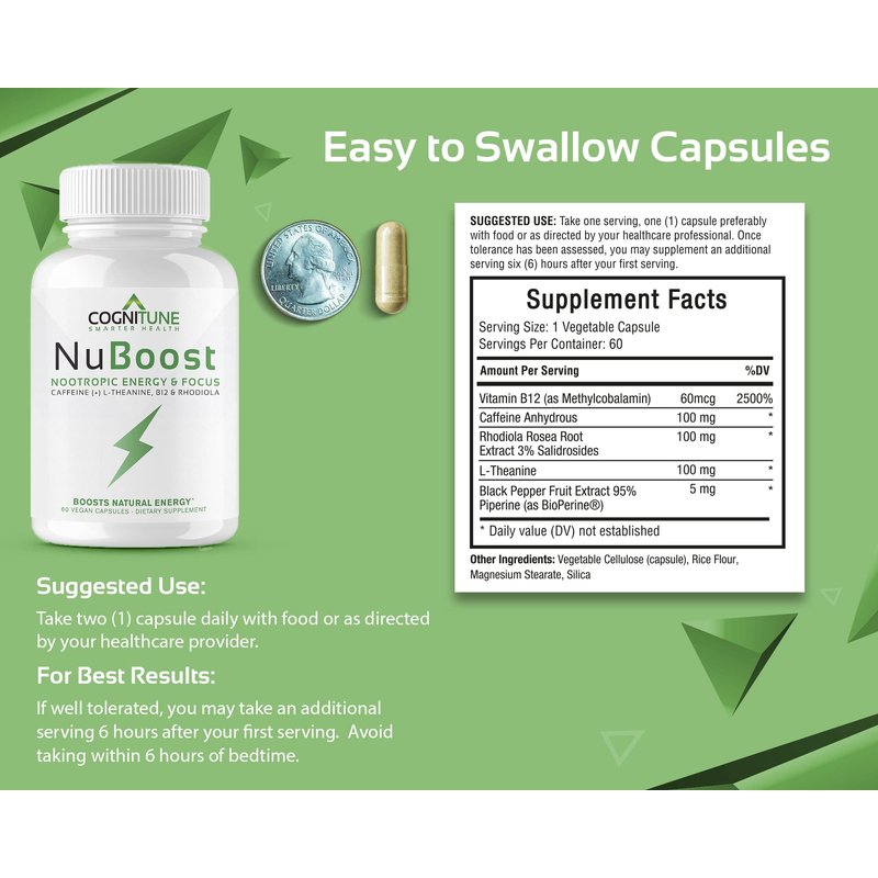 - [Clean Energy Booster] NuBoost contains only caffeine anhydrous, l-theanine, rhodiola rosea, vitamin B12, and BioPerine for a clean alternative to help eliminate brain fog and start your day. Skip the empty calories, sugar, and expense of energy drinks or coffee, and avoid heart racing energy pills.