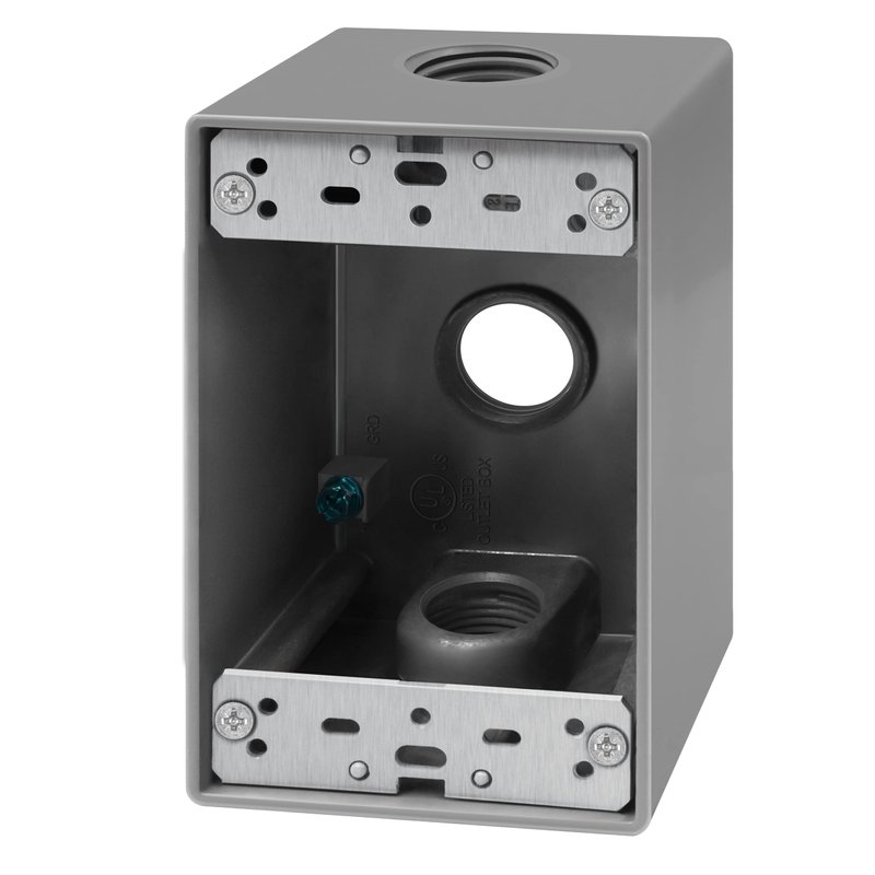 - Weatherproof outlet box designed to house a single-gang switch or receptacle in moisture-prone and outdoor locations; includes three 0.75” diameter threaded holes