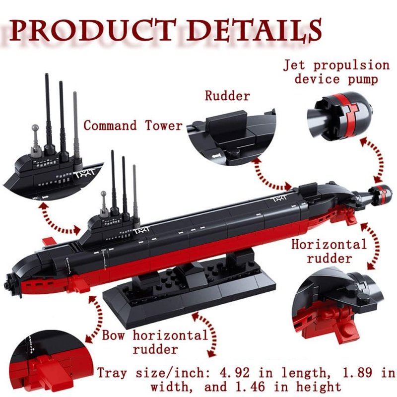- 【Exquisite Details】This simulated nuclear submarine model features exquisite details such as a command tower, rudder, jet propulsion pump, and horizontal rudder. These military nuclear submarine building blocks can help your child innovate, create new, interesting, and unique ideas.