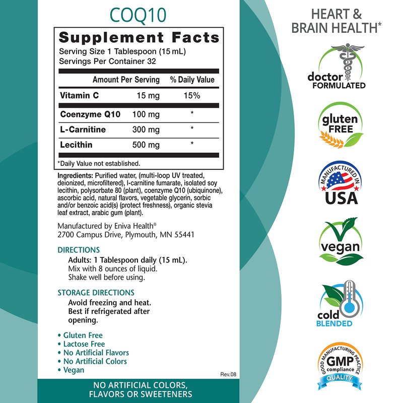 Eniva Health Liquid CoQ10 100mg (16oz) Plus L-Carnitine, Vitamin C, Lecithin Gluten Free. Zero Sugar. Keto Friendly