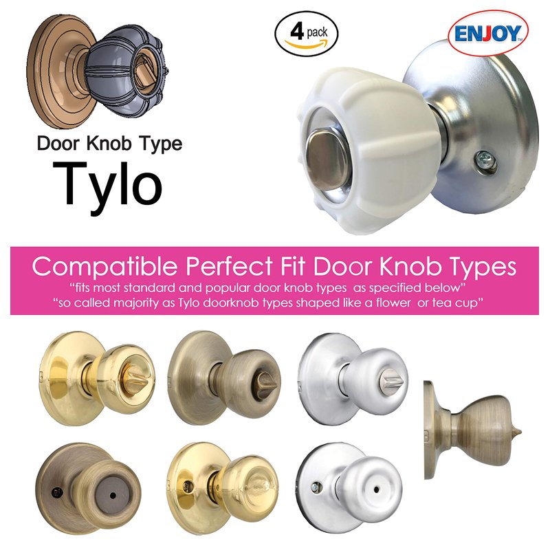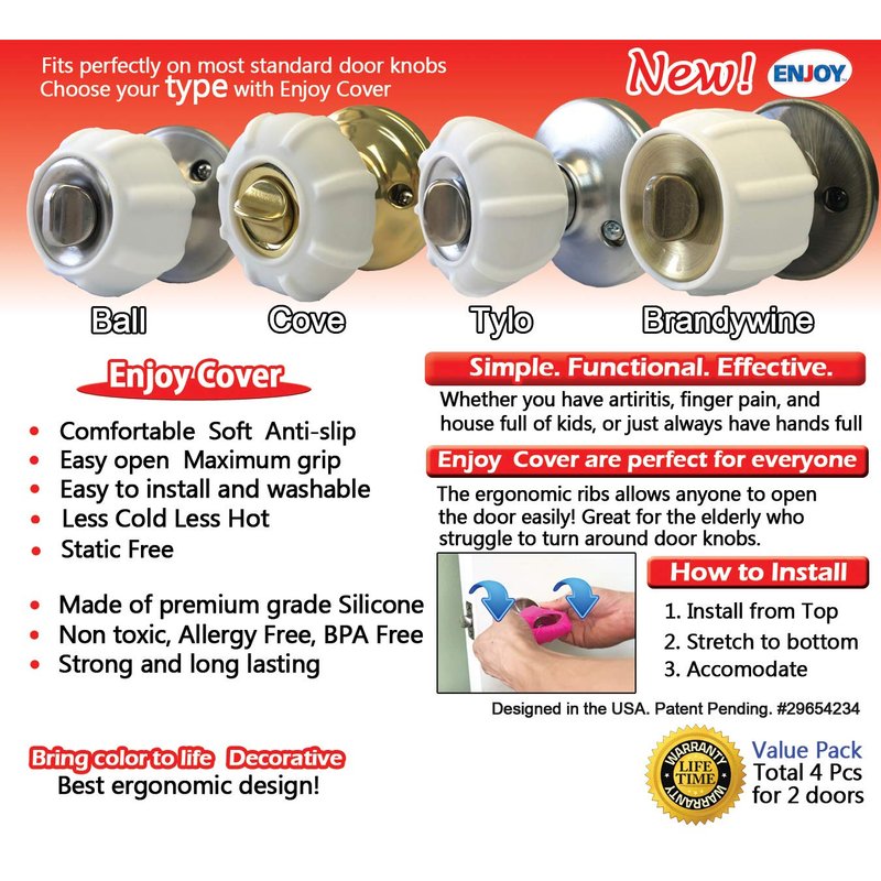 Type: Tylo Color: White Value Pack: 4 Door Knob Covers for 2 Doors. Best Value on the market. New Enjoy Cover offers the best simple, functional and effective product that serves a great need. It's perfect for everyone, whether you have arthritis, finger pain, and a house full of kids, or just always have hands full Enjoy Cover is ergonomically designed with ribs which allows anyone to open the door easily! Great for the elderly who struggle to turn around doorknobs and kids always finding hard to turn the regular slippery doorknobs it truly relieves hand pressure with an easy turn. It's comfortable and yet soft and anti-slip, Maximum Grip, Easy to install and have a perfect fit. Easy to wash and clean with water and soap, No more static shock, Less cold and Hot to the touch. Made of premium grade silicone, strong and durable. Decorative, bring color to life! Personalize your room with various colors soon available. We offer the most standard popular sizes Ball, Cove, Tylo, Brandywine, Please check the doorknob type in order to get the right perfect fit.