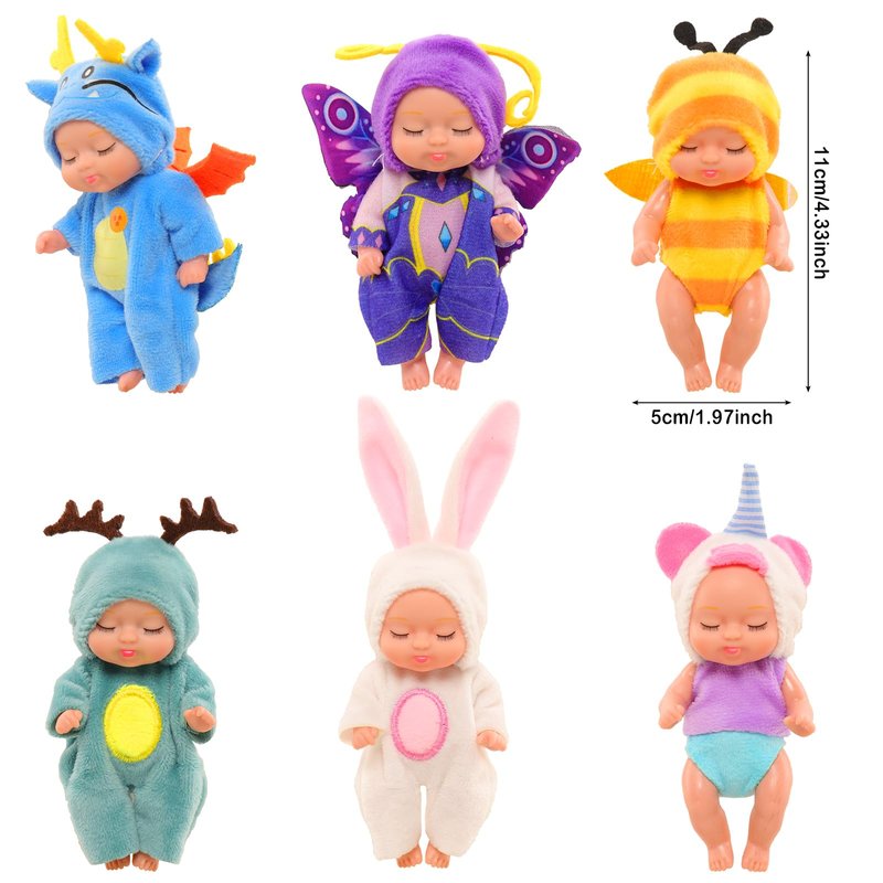 Realistic doll: 4 inch mini rebirth doll, 6 doll clothes styles include: little rabbit , little butterfly , little dinosaur , unicorn, elk, little bee, 11 cm/ 4 inches, and each mini rebirth doll with movable joints and adjustable posture