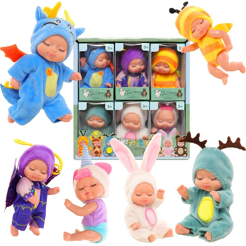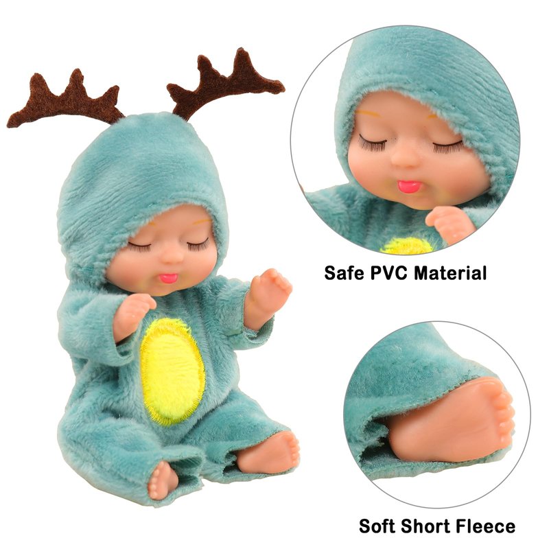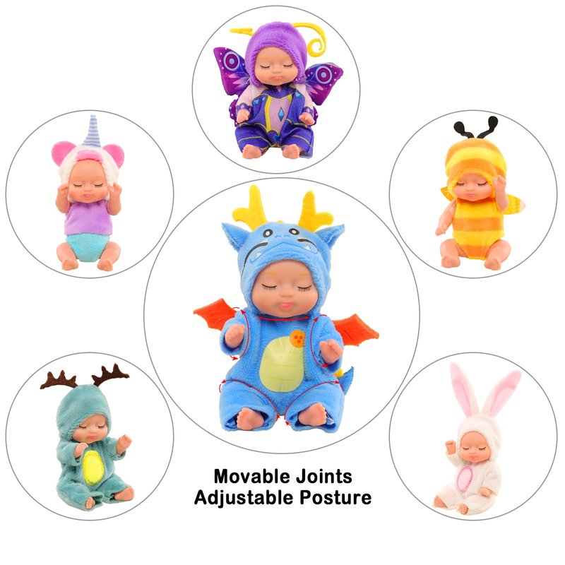 - Realistic doll: 3 inch mini rebirth doll, 6 doll clothes styles include: little bee, little rabbit, little butterfly, elk, unicorn, dinosaur, with movable joints and adjustable posture.
