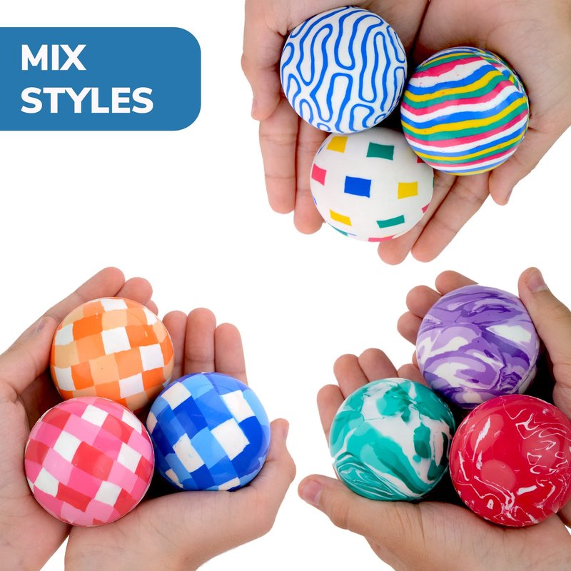 Package includes 6 large bouncy ballsEach bounce ball is 2.35 inchBouncy balls are great toys for party favors, treasure chest and carnival prizes. Large bouncy balls for kids makes it the ultimate gift for any occasion - be it Christmas, Halloween, Easter or just a family party. Super bouncy ball will captivate kids' mind for days - yes, high bouncy balls are that amusing.Tired of low quality balls? Choose our high quality bouncy rubber balls that won't let you down.These rubber balls for kids are made from quality rubber. They bounce off tiles, wooden floors, pavement, bricks - see for yourself their excellent jumping ability, which will certainly please you.Ask around - each and every kid simply loves to play with bouncing ball each time they get a chance. Rubber balls for kids bring delightful and memorable moments each and every time.Excellent bouncing and high quality - this is your best choice of bouncy ball party favors.These high bouncing balls are able to float in water. It makes bouncy balls for children a great swimming pool and bath toy. Kids love floating colorful bouncing balls - they immediately catch their eye, just throw a few super bounce balls into the water.These beautiful bounce balls are brightly colored. Assorted bouncy balls are best suited for kids. Nevertheless, keep in mind that bouncy balls big feature is to bounce really high, thus these big bouncy balls might be too bouncy for kids.Have a pet? Rubber super balls will quickly become one of your pets' favorite toys. Rubber bouncing ball will keep your pet entertained for hours. Bouncy balls rubber texture has a pleasant shaggy surface to it. Moreover, big bouncy ball doesn't get stuck, so your pet won't bother you with getting a rubber bouncy ball under the furniture.