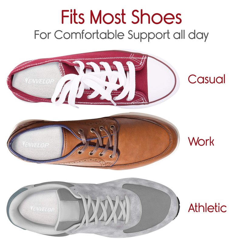 - 𝗥𝗘𝗟𝗜𝗘𝗩𝗘𝗦 𝗙𝗢𝗢𝗧, 𝗛𝗘𝗘𝗟 𝗔𝗡𝗗 𝗔𝗥𝗖𝗛 𝗣𝗔𝗜𝗡: Customizable, the 3/4 gel inserts can be trimmed for a perfect fit. The supportive gel insoles feature a textured base to minimize slipping. Suitable for most shoe styles, including casual, athletic and dress shoes, as well as boots.