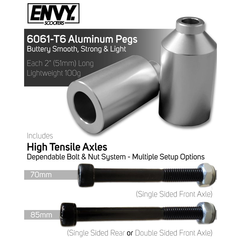- GET RIDING - This Peg Set includes two pegs with two high tensile axles, so you can install them right away and get riding! Perfectly fits all Envy Scooters and most other stunt scooters.