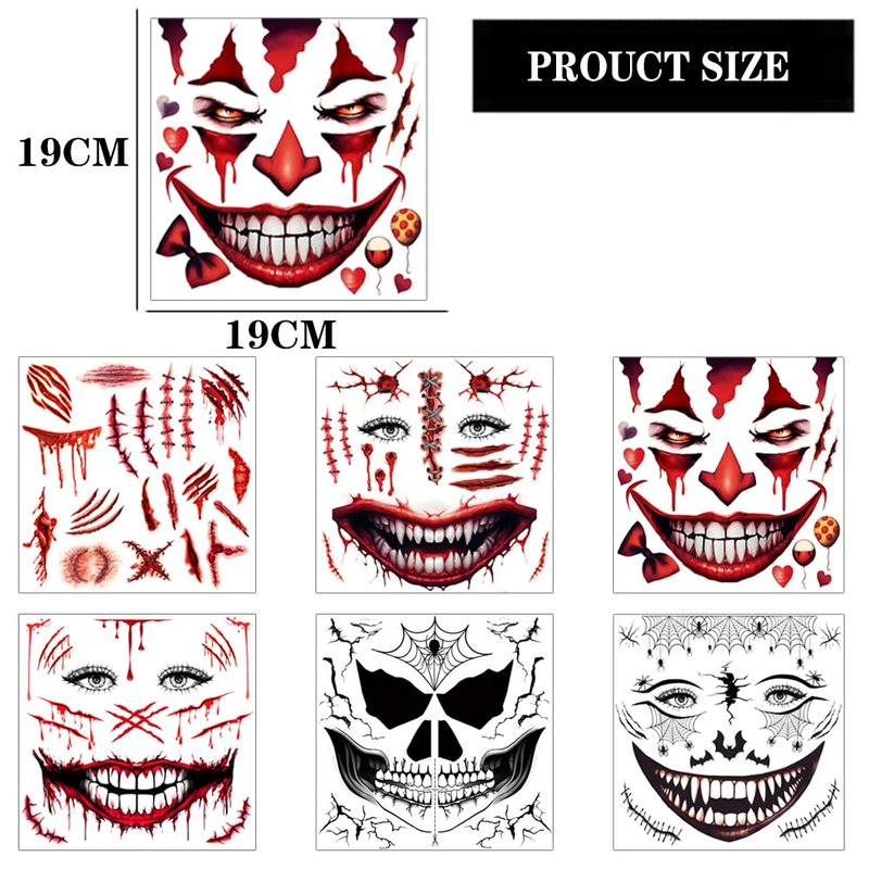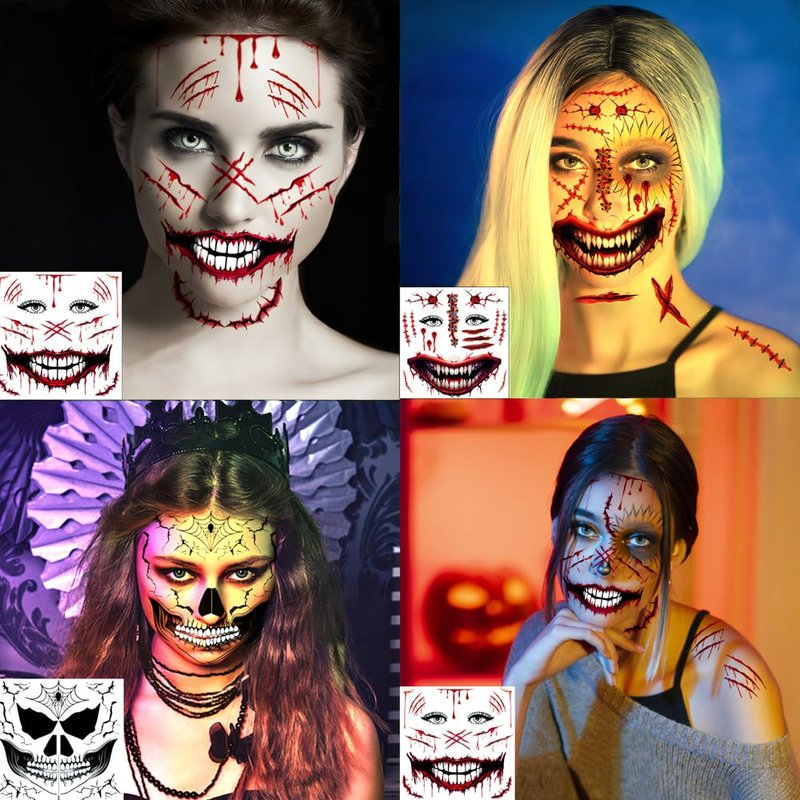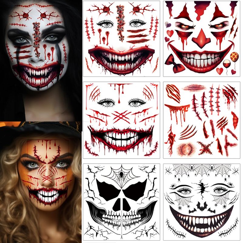 • 🎃 Spooky Halloween Collection: Get into the spirit with 5 sheets of realistic Halloween face tattoos+1 sheets of fake zombie scars featuring chilling designs like skeleton mouth, devil faces, clown face and spider webs.