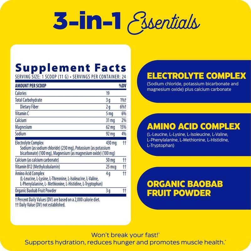 - 3-in-1 Ultimate Drink Mix for Intermittent Fasting: Packed with hydrating electrolytes, baobob fiber for appetite control, & 9 essential amino acids to promote muscle health.*