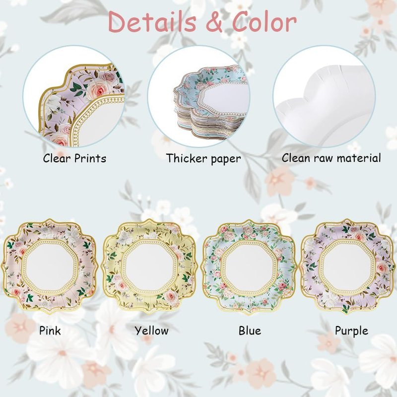 - Value Pack: The Spring Party Plates Set contains 4 colors of 9 inch tea party disposable plates in pink, purple, blue and yellow, 12 pieces of each color, total 48 pieces.