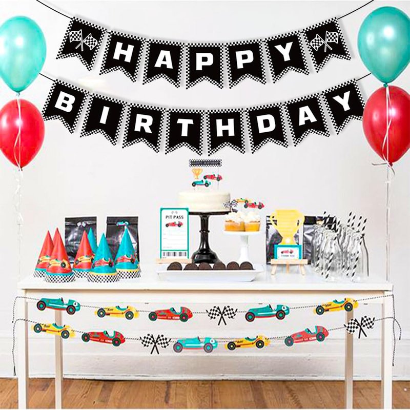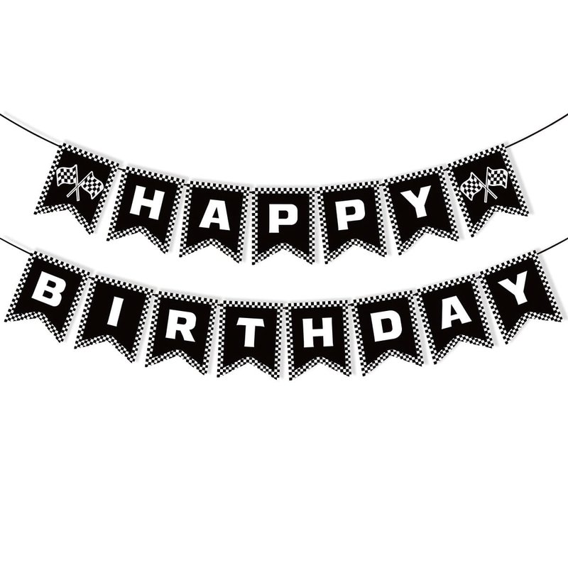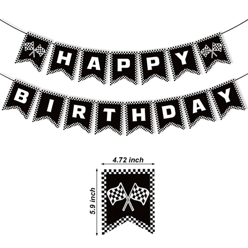Great race car birthday party decorations to use on the living room, yard, garden, ceiling, in a doorway, window, etc, or as a photo booth photo prop. Can impress family and friends at a party. Includes: 1 Set ""HAPPY BIRTHDAY"" banner letters 1 Roll of ribbon 1 Pcs thread needle Kindly Tips: DIY needed: The black and white checkered racing theme happy birthday banner bunting birthday party decoration supplies need to be assembled. Due to different screen monitors, there may be slight differences in color. Due to manual measurement, there may be slight errors in product size.
