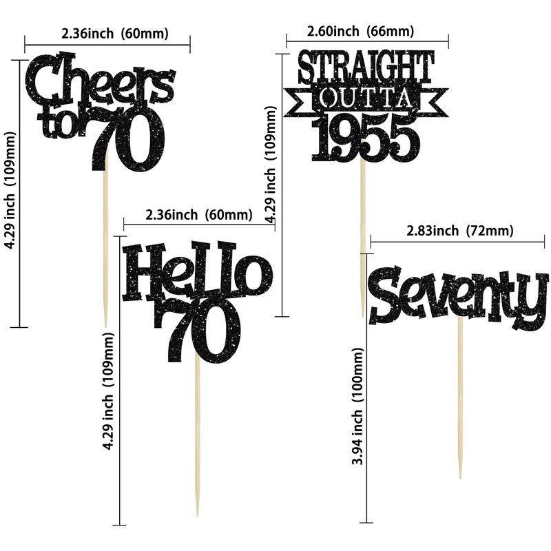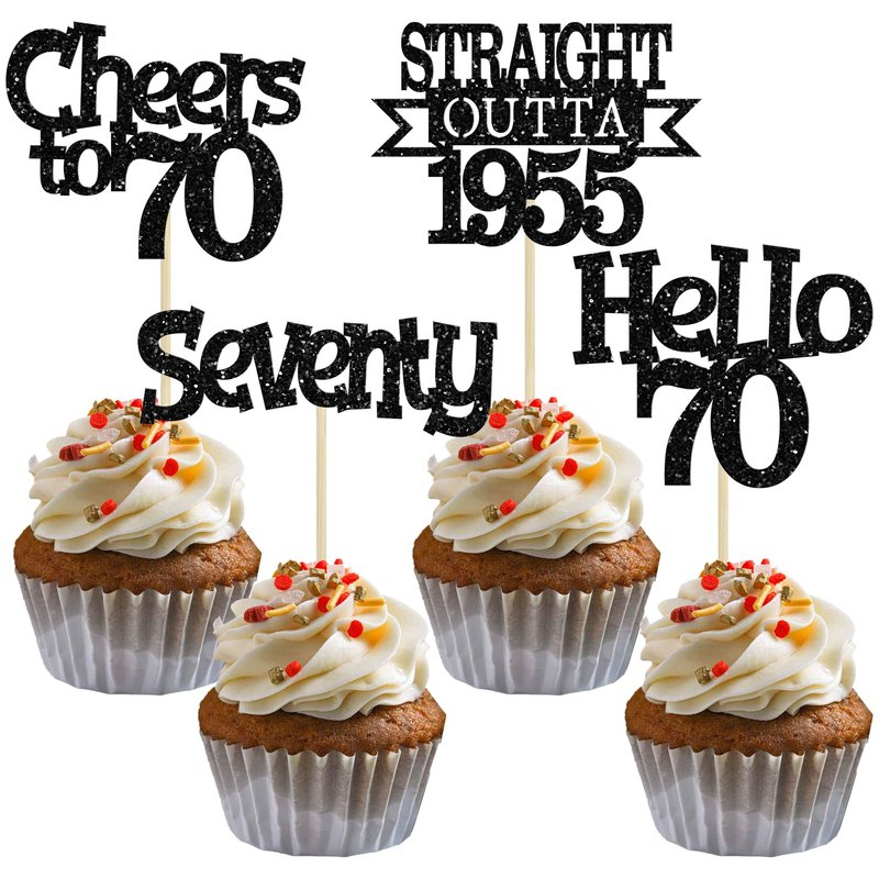 Ephlyn 24Pcs Happy 70th Birthday Cupcake Toppers Glitter Straight Outta 1955 Cupcake Picks Hello 70 Cheers to 70 Years Birthday Cake Decorations for 70th Birthday Anniversary Party Supplies Black