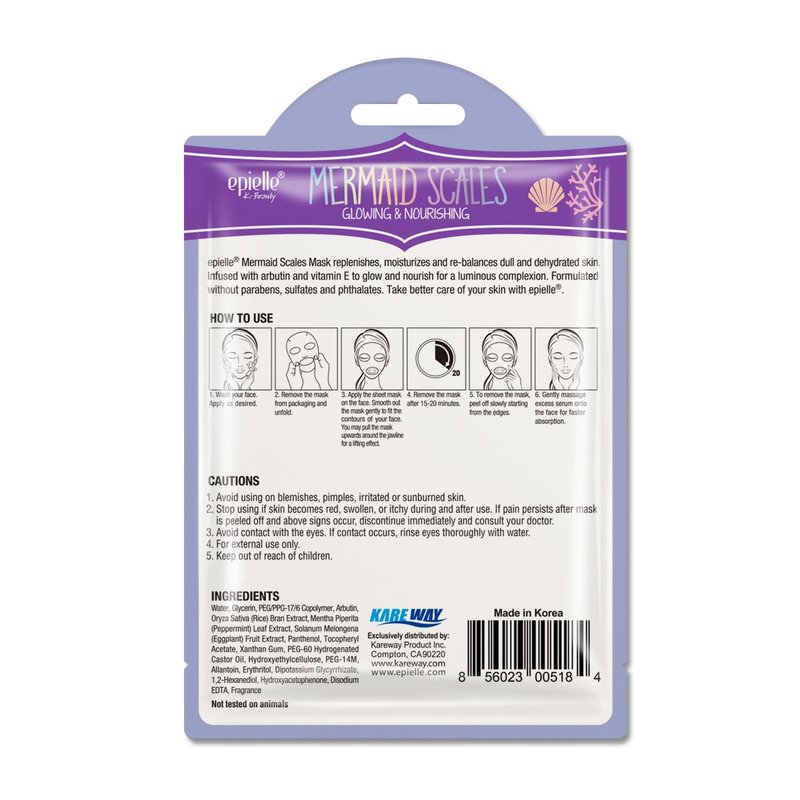 epielle Mermaid Mask comfortably adheres to the face like a second skin that tightly seals in moisture for a healthier look and radiant glow. The combination of Collagen and fruit extract help to moisturize and lift skin for a more youthful appearance. Moisturize your skin with this playful Mermaid print mask for some fun in your skin care routine! Formulated without animal oil, mineral oil, parabens and petrolatum. Take better care of your skin with epielle.