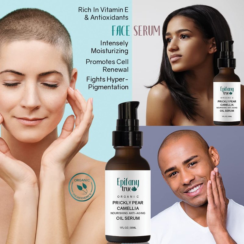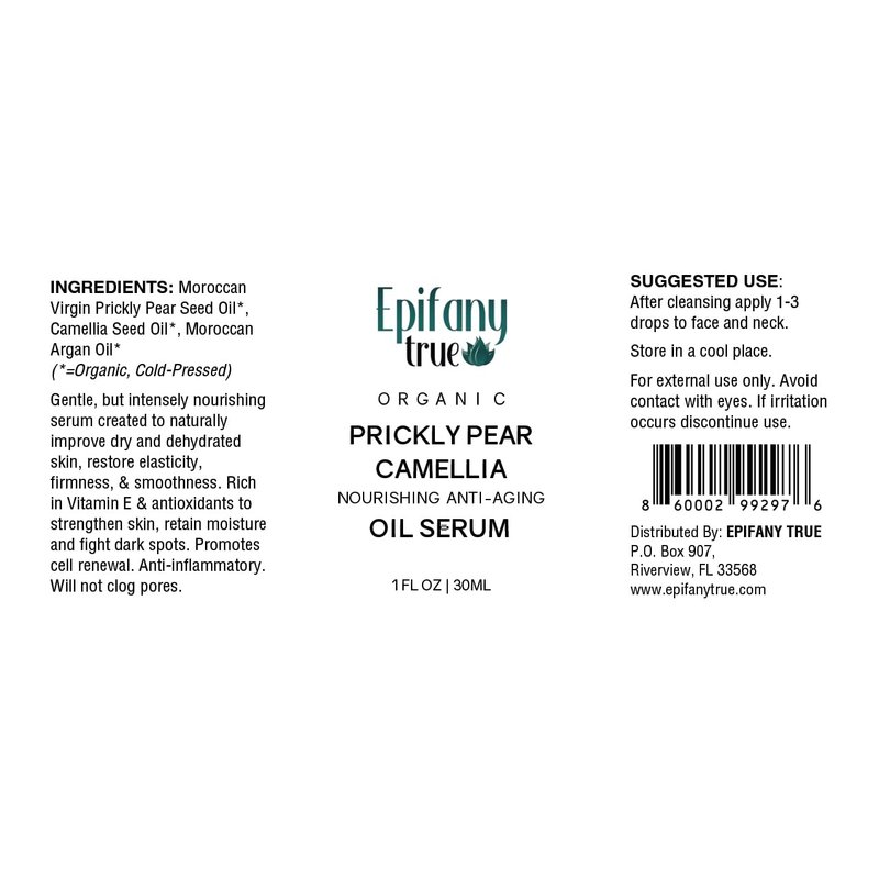 Epifany True Prickly Pear Camellia Face Oil Serum is an all-natural, unscented intensely moisturizing Vitamin-E-Rich face oil blend created to replenish very dry skin. Using this oil may help to retain moisture in the skin and promote smoother skin. Together, this carefully balanced blend of all cold-pressed certified organic Moroccan Prickly Pear Seed Oil, Japanese Camellia Seed Oil and Moroccan Argan Oil provides healthy and natural skin replenishing properties to may help address common skin concerns. We chose virgin organic cold-pressed Moroccan Prickly Pear Seed Oil as our main ingredient because it is known to have a very high concentration of Vitamin E and also Vitamin K. It has a light natural earthy, nutty scent. Suggested Use: After cleansing, apply a few drops of face oil serum to face and neck several times per week, preferably at bedtime, by gently massaging or patting into skin until absorbed.