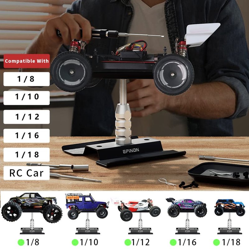 - 【RC Car Work Stand Compatibility】Suit for 1/8 1/10 1/12 1/16 1/18 Scale brands RC trucks crawler buggies, suit for Slash Arrma Redcat Axial FMS RC4WD Tamiya Kyosho Globact Wltoys, etc.