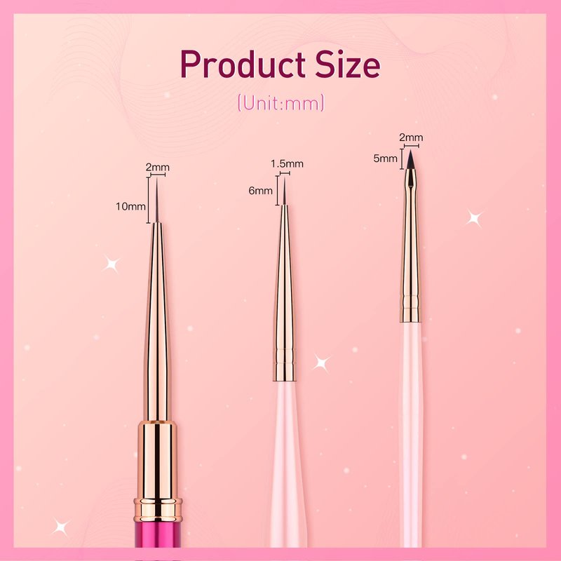 - 【Set of 3 Nail Brushes Pens】 3 pieces nail art brush with 3 different shape. Liners sizes: 6mm, 10mm. Carved burshes sizes: 5mm. Different sizes liner and brush contribute to delicate jobs and small details and capable of adapting to various lengths and sizes, help you to create beautiful nail designs