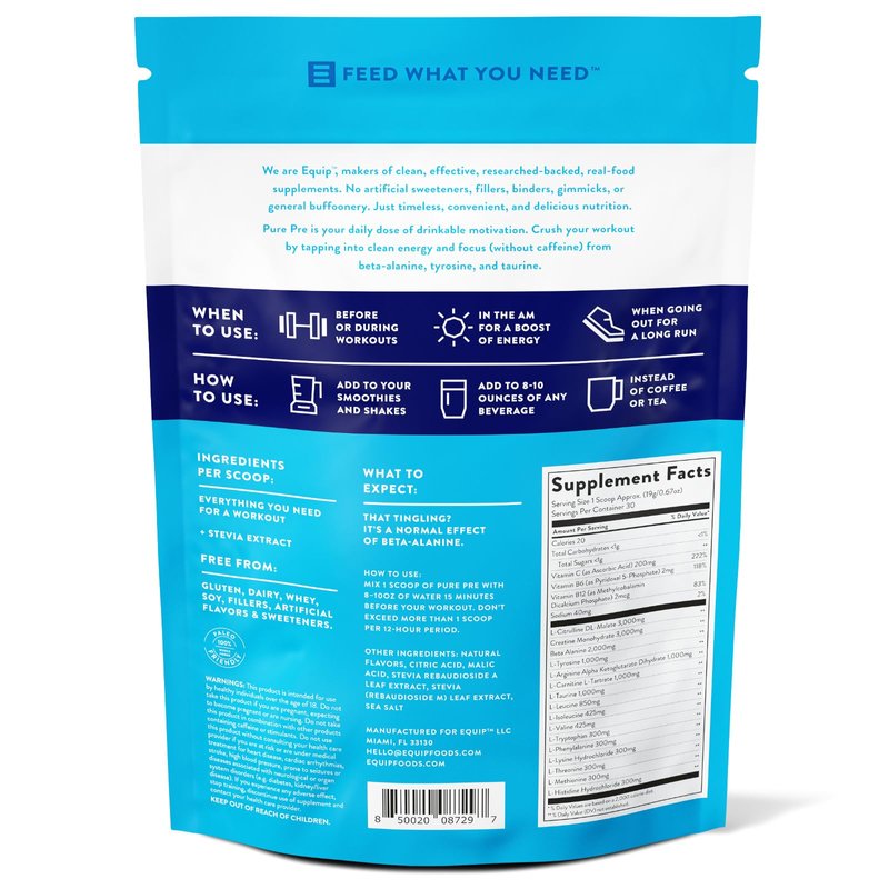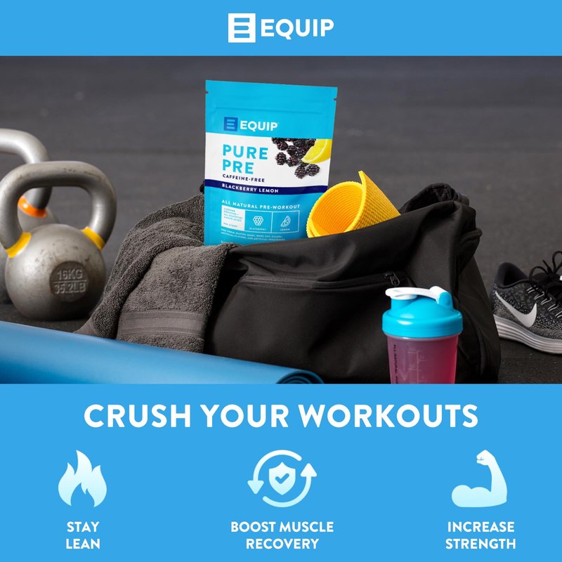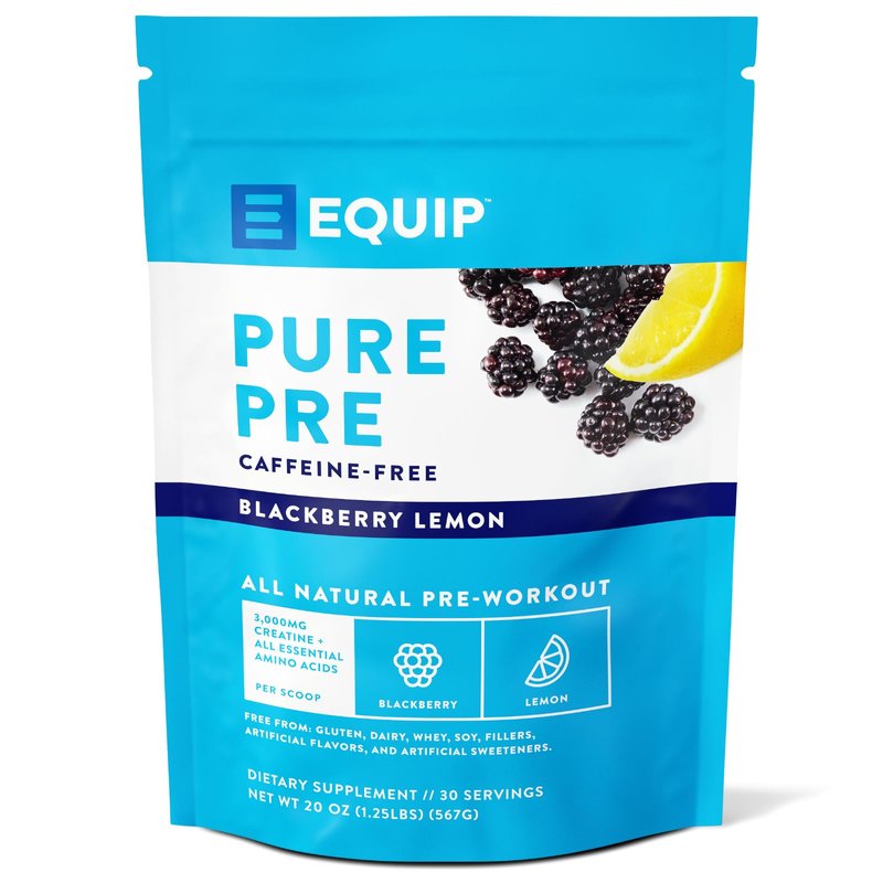 Equip Foods Pure Pre All Natural Pre-Workout Powder | Caffeine Free, EAA, Vitamin C, B6, B12, L-carnitine, Agnine | Naturally Boosts Workouts | 30 Servings, BlackBerry Lemon Decaffeinated