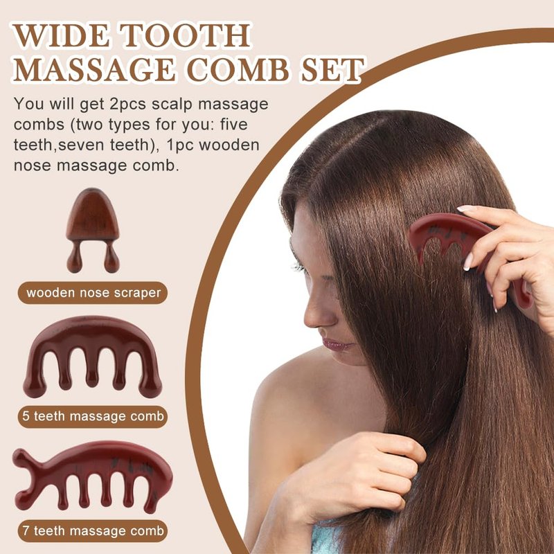 - 【MASSAGE COMB SET】You will get 2pcs scalp massage combs(two types for you: five teeth,seven teeth),1pc wooden nose massage comb.The wide tooth easy to comb your straight or curly hair, without any hurt. It is portable to use and suitable for a massage role.Small and light, easy to put into the carry on bag, convenient to carry.