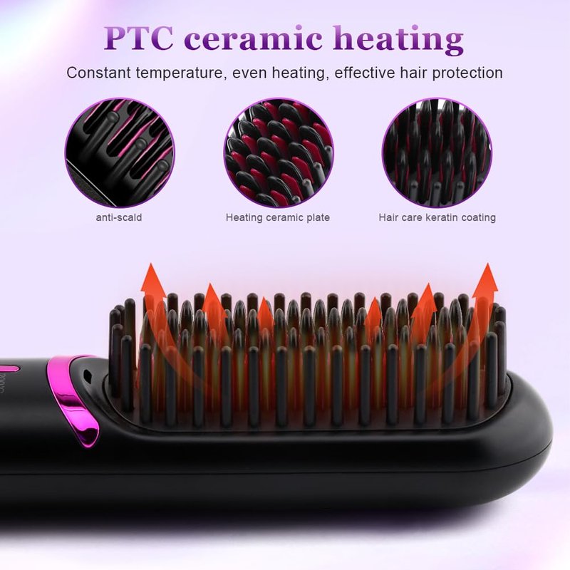 【CORDLESS AND RECHARGEABLE】The hair straightener brush has a built-in powerful and large-capacity rechargeable battery. It can be used for about 1.5-2 hours after being fully charged.