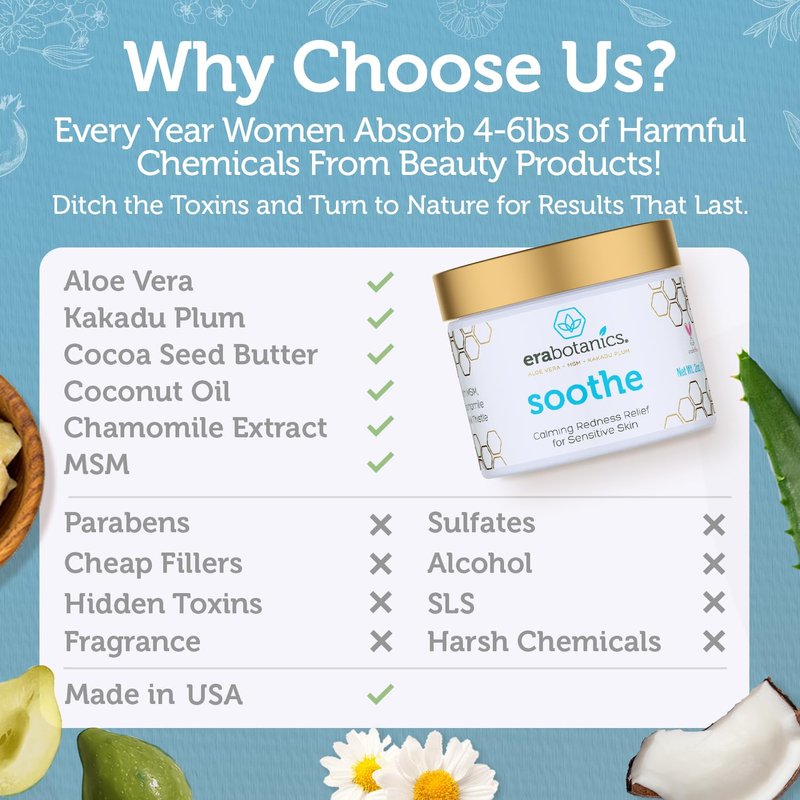 Tired of A Dry, Red, Irritated Looking Complexion? You’re not alone! Millions of people want to have calmer, more balanced skin and spend a lot on medications that actually weaken their skin. Hidden chemicals found in facial treatments could actually be doing more damage to your skin than good. That’s why we’ve formulated a botanical facial cream to help soothe redness with ingredients shown to work. Nourish, soothe, hydrate and rejuvenate your skin without any side effects. Ingredients Your Skin Will Love: We’ve combined a robust formula including: Organic Aloe Vera, Milk Thistle, MSM, Avocado Oil, Cocoa Butter, Coconut Oil, Chamomile Extract and more Our ingredients are shown to help : - Help reduce the symptoms of irritation - Deep moisturization that lasts. - Calm dry redness - Reduce dry skin itch - Support Recovery - Get a Smoother, Softer, More Balanced Complexion With Moisturizing Nourishment. As a family owned company, results are everything to us. We take customer service and satisfaction quite seriously.